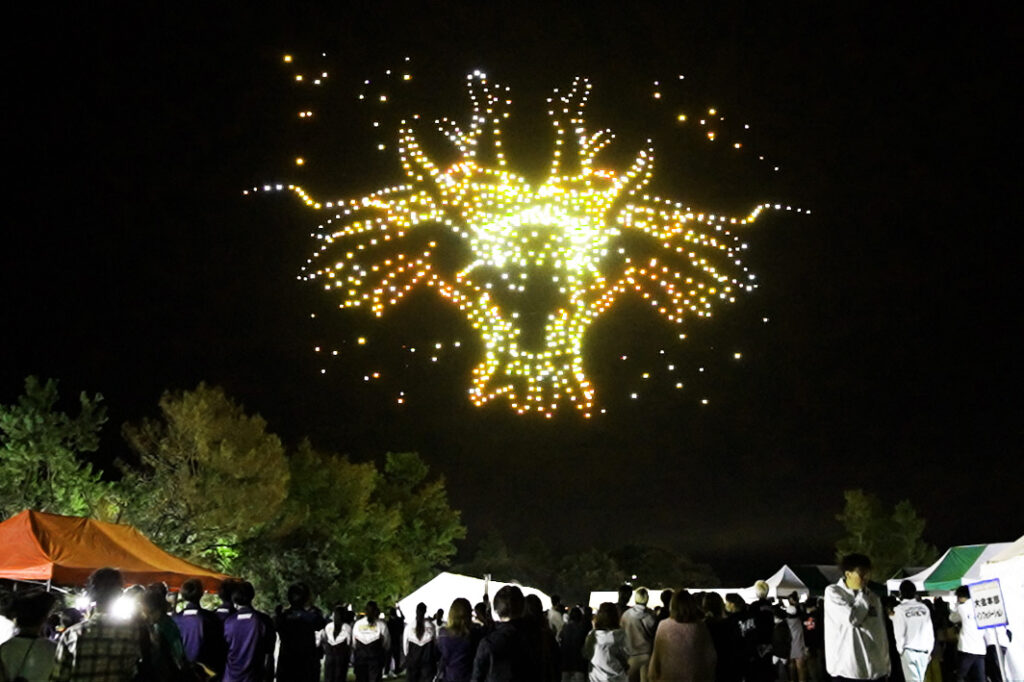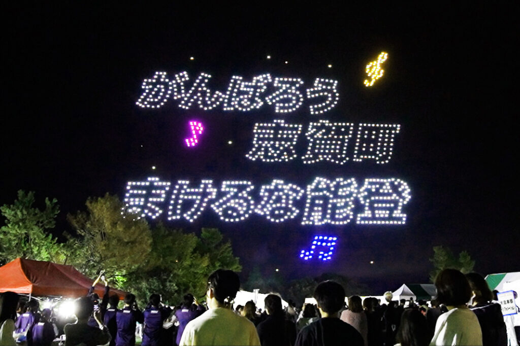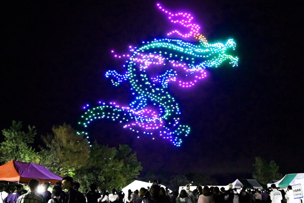 ドローン1,000機による北陸最大級のドローンショーでは、夜空に能登キリコや巨大な龍がダイナミックに躍動し、ショー終盤には「かんばろう志賀町・まけるな能登」という能登復興応援メッセージも描かれ、観覧者から大歓声が上がりました。