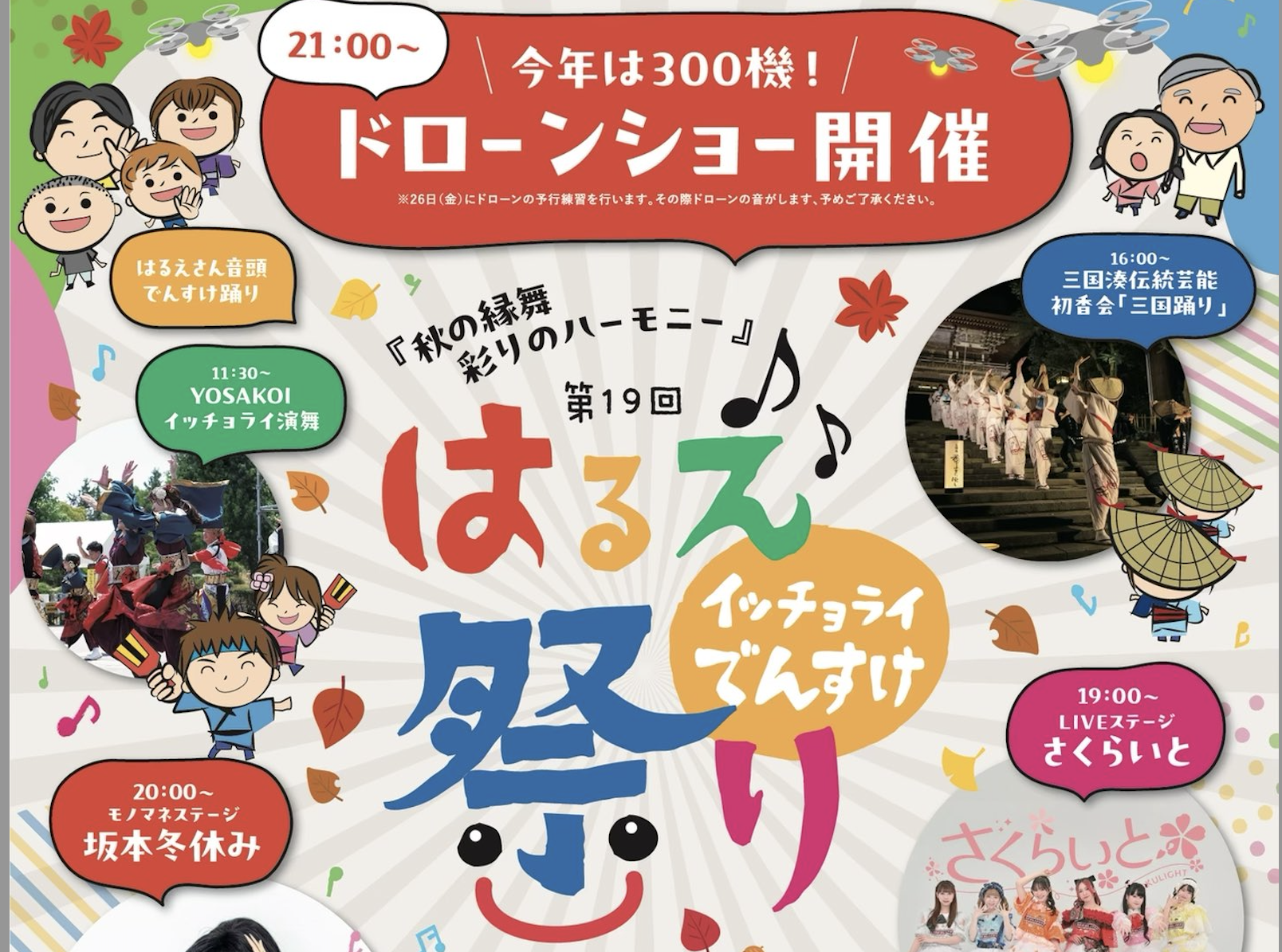 9/27(土) 21:00〜 第19回はるえイッチョライでんすけ祭り内にてドローンショー開催!