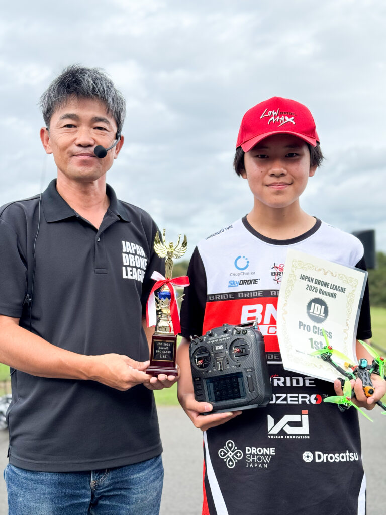 ドローンショー・ジャパンがスポンサーする高校生FPVドローンレーサー・山本悠貴選手(15歳、以下「山本選手」)が、2025年9月21日に兵庫県加東市で開催された「2025 JAPAN DRONE LEAGUE(JDL、https://www.japandroneleague.com/)」のRound6・Proクラスにおいて初優勝いたしました。山本選手にとってJDL参戦5年目で初のチャンピオンとなり、これまでの挑戦が実を結ぶ形となりました。