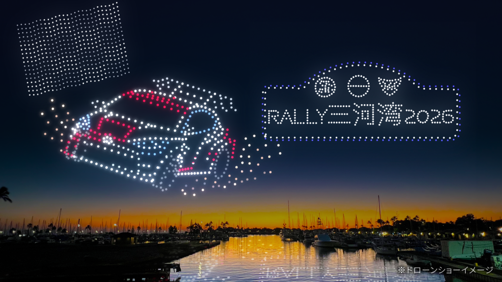 株式会社ドローンショー・ジャパン(本社:石川県金沢市、代表取締役:山本 雄貴)は、株式会社ラグナマリーナ(本社:愛知県蒲郡市、代表取締役社長:林 豪)との共催により、2026年2月27日(金)~3月1日(日)に開催される2026年全日本ラリー選手権開幕戦「RALLY 三河湾 2026 Supported by AICELLO」の期間中、ドローンショー「RALLY 三河湾 2026 Night Canvas」をラグーナ蒲郡エリア(愛知県蒲郡市海陽町2-1)にて観覧無料で実施いたします。日本のラリー選手権に関わるドローンショーは今回が初の開催※ となります。